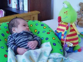 Here you can see her looking with great concentration at her new favourite toy, Mr Croak, that Aunty Bernadette bought for her. The other day she was on her playmat but kept on looking behind my shoulder - I turned around and there was Mr Croak looking back at me. So I plopped him down next to Harriet and she went psycho! All flailing limbs and gurgling excitement, she kept trying to touch all the bits of her Mr Croak. Then when she finally got to touch him, she kept going for the crackly bit. So cute! So she now has some playmat + Mr Croak time in each play session and she loves it.